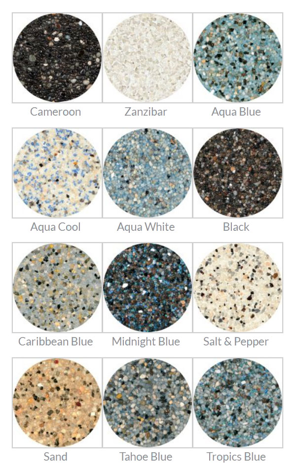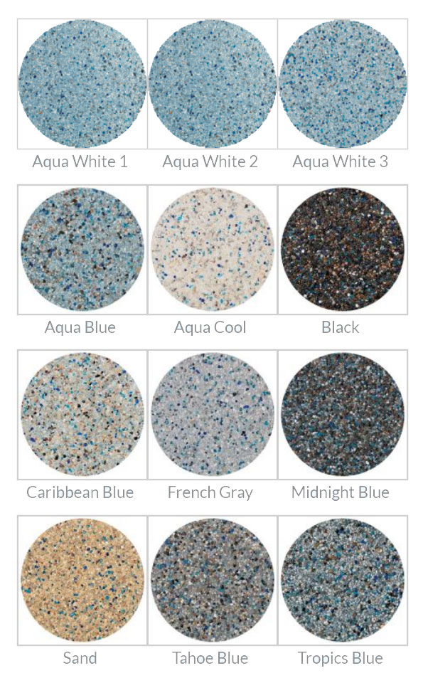 Pebble finishes consist of small , smooth river pebbles embedded in the pool finish product. Pebble pool finishes have grown hugely in popularity over the past few years. They are extremely durable and resistant to the chemicals in the pool water. There is a wide array of colors and color combinations available that can be used to get just the look you want.